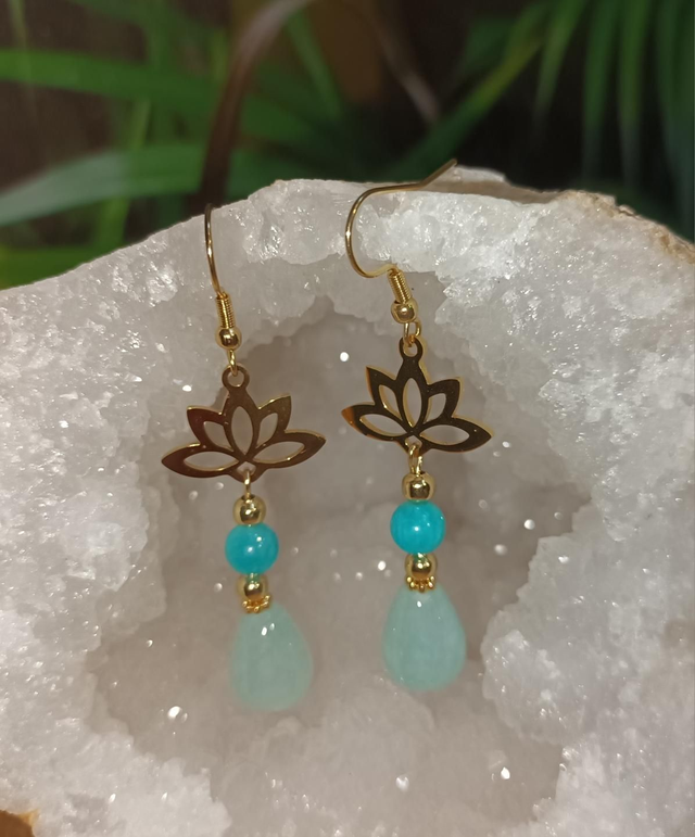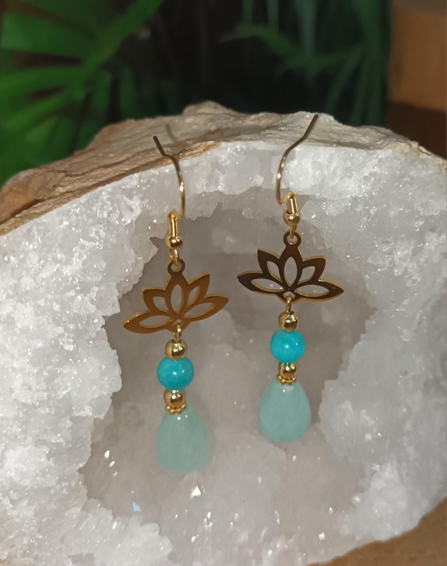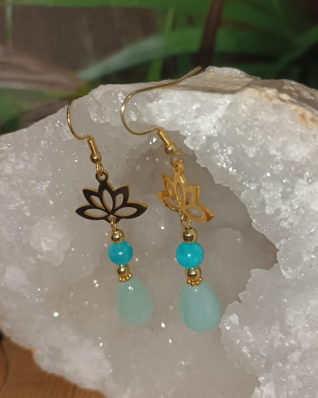 L’association de la perle et de la goutte crée un mouvement subtil et une harmonie visuelle très élégante. L’amazonite, avec son bleu‑vert apaisant, contraste magnifiquement avec la finition dorée pour un rendu moderne et frais.