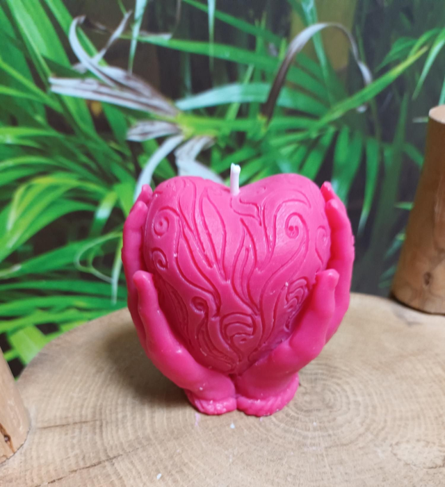 Plongez dans un univers de douceur et de sérénité avec cette bougie unique en forme de cœur, délicatement enveloppée par deux mains protectrices.