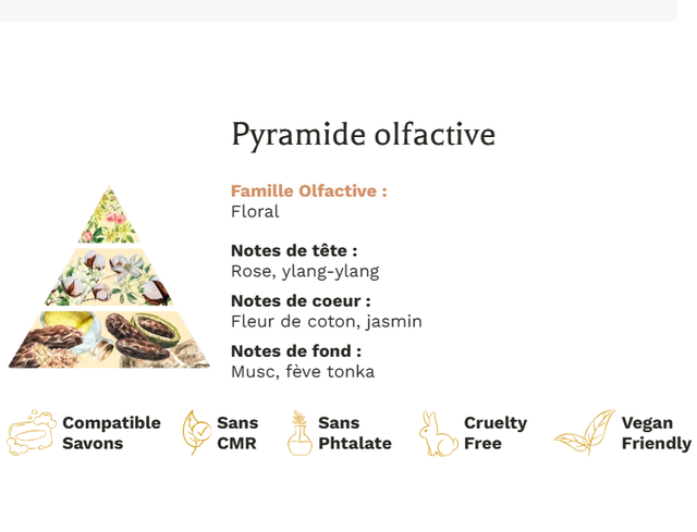• Senteur : Parfum de Grasse (10%) – Fleur de coton