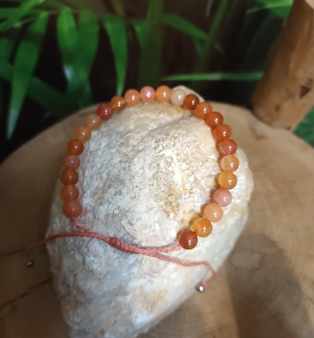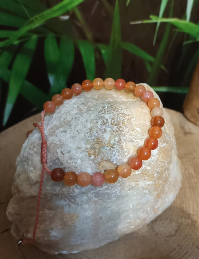 Réalisé à la main, ce bracelet est confectionné à partir de fil polyester ciré LINHASITA, reconnu pour sa résistance et sa durabilité. Il est orné de perles naturelles de 6 mm en agate de feu, une pierre aux reflets flamboyants et à l’énergie intense. Son design ajustable permet un ajustement parfait au poignet, offrant confort et élégance au quotidien.