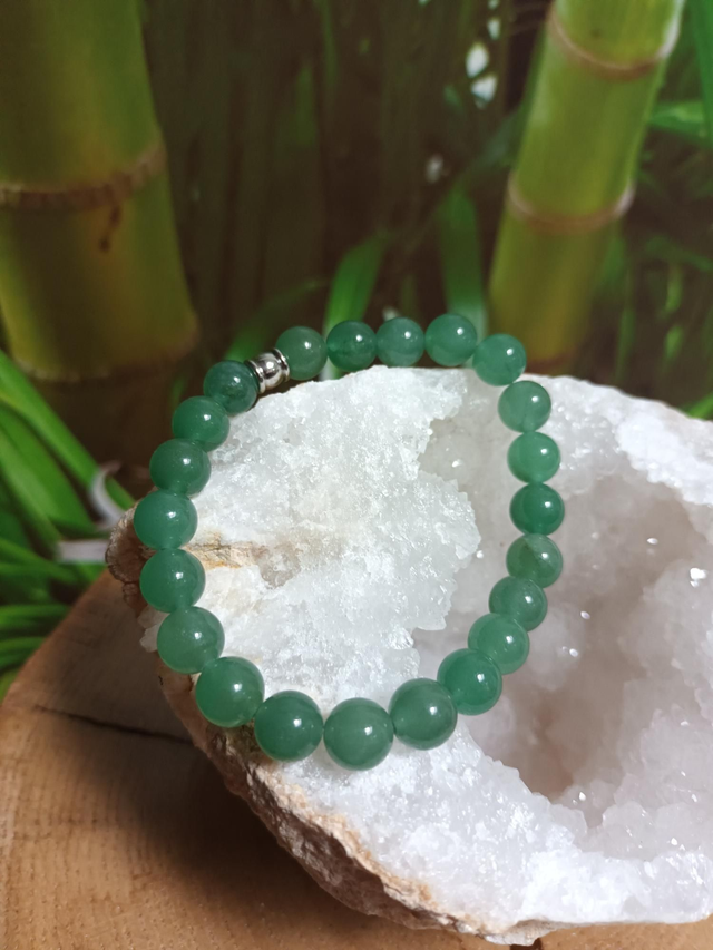 Ce bracelet, réalisé avec des perles de 8 mm en aventurine verte, est agrémenté d’une breloque en acier inoxydable. Un bijou élégant qui conjugue apaisement et énergie positive.