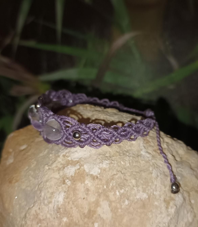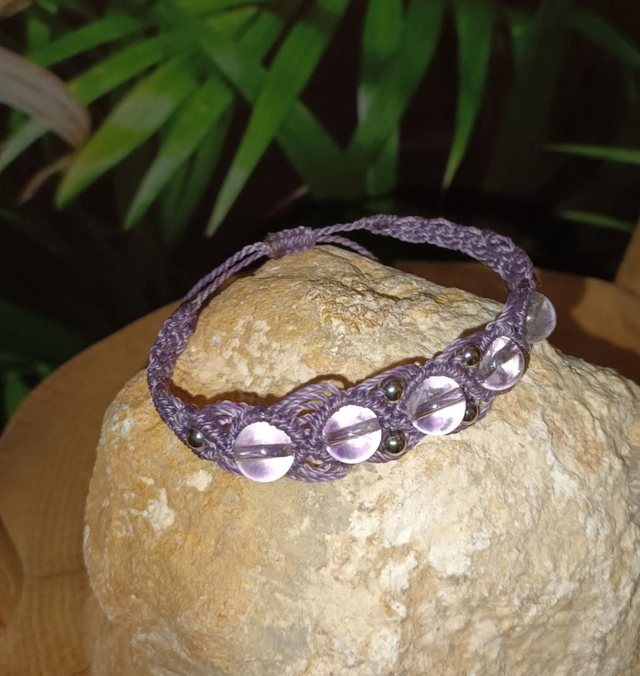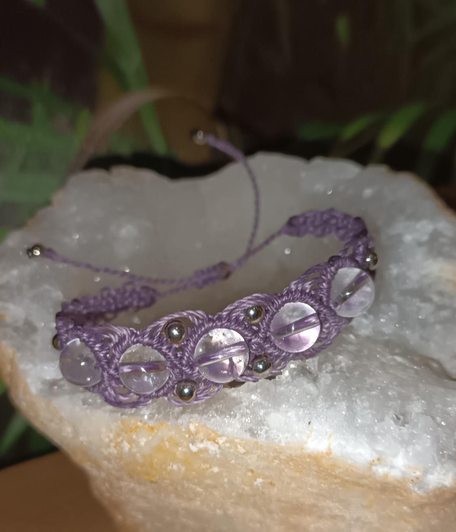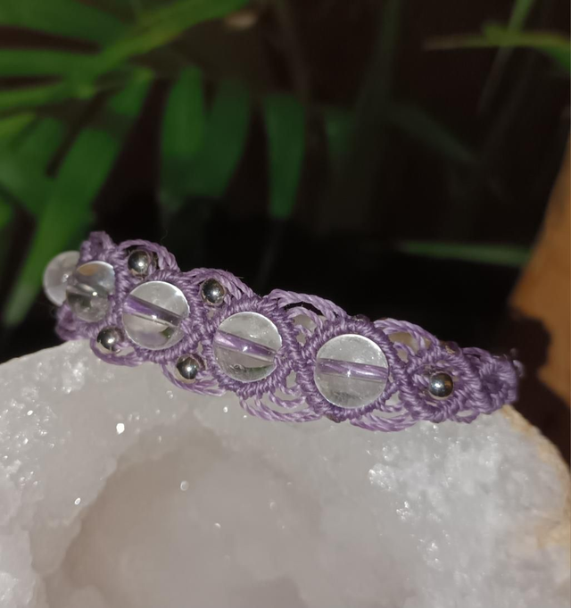 Bracelet en micro-macramé réalisé avec du fil polyester ciré LINHASITA. Orné de perles en cristal de roche et de petites perles en acier inoxydable, il présente un design ajustable qui épouse parfaitement le poignet, alliant douceur et élégance.