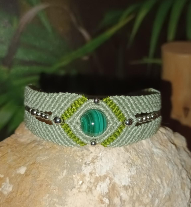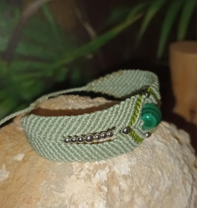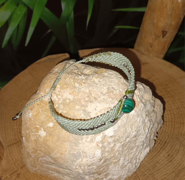 Ce bracelet est entièrement réalisé en micro‑macramé, une technique artisanale qui offre finesse, solidité et confort. Il est orné d’une perle naturelle de malachite, reconnaissable à ses magnifiques stries vertes, ainsi que de perles en acier inoxydable qui ajoutent une touche moderne et lumineuse.