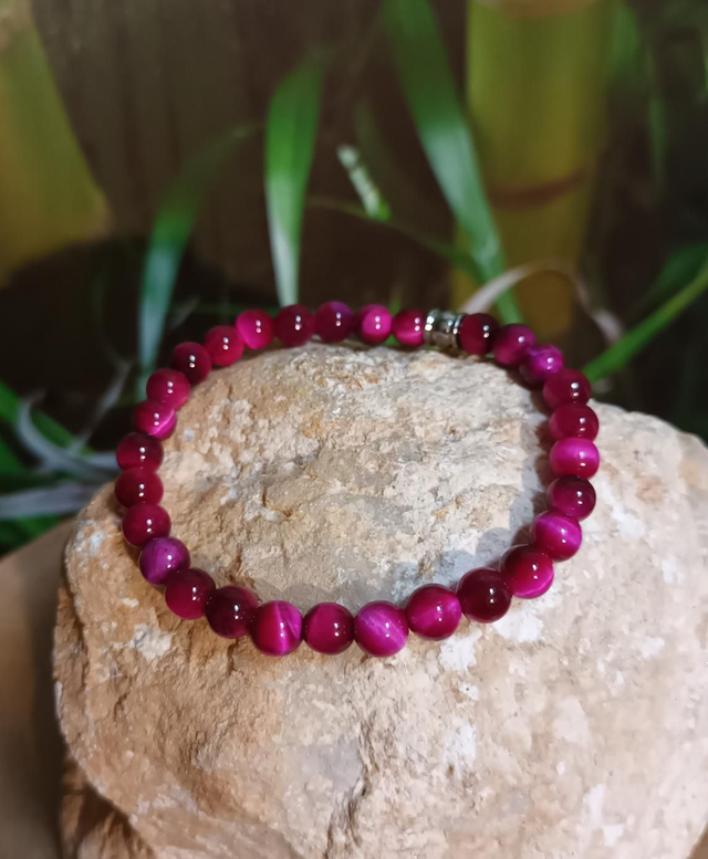 Ce bracelet est composé de perles d’œil de tigre teinté rose de 6 mm, agrémenté d’une breloque en acier inoxydable. Monté sur un fil élastique résistant, il allie élégance et confort au quotidien.