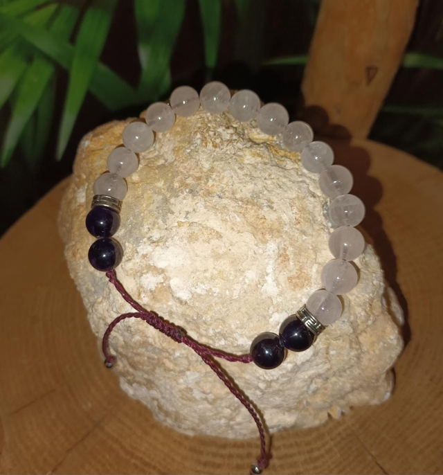 Réalisé à la main, ce bracelet est confectionné à partir de fil polyester ciré LINHASITA, apprécié pour sa solidité et son confort au quotidien. Il est orné de perles naturelles de 8 mm en quartz rose, une pierre douce et réconfortante, ainsi que de perles d’améthyste qui apportent harmonie et sérénité. Plusieurs breloques en acier inoxydable complètent l’ensemble, ajoutant une touche moderne et élégante. Grâce à son design ajustable, il s’adapte parfaitement au poignet, offrant un maintien agréable et une allure raffinée.
