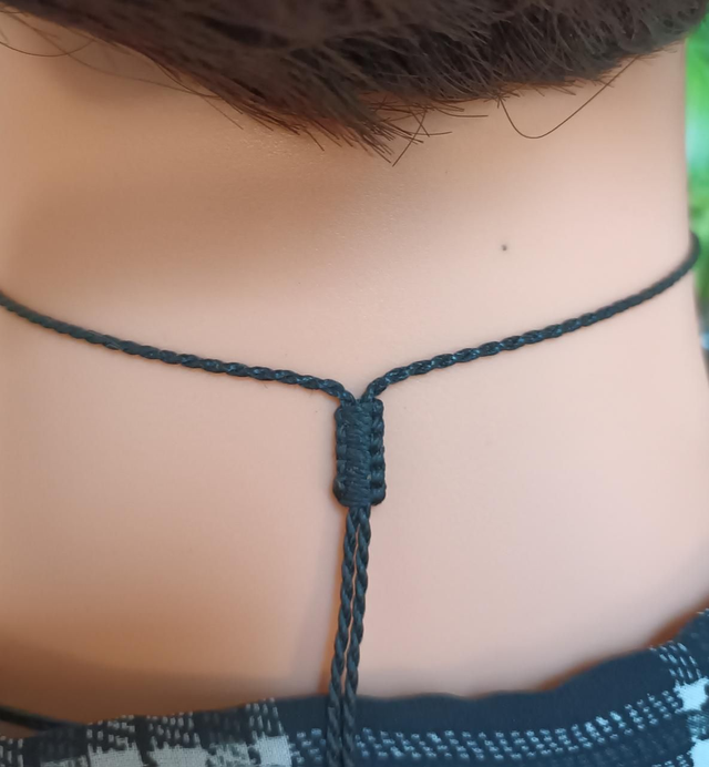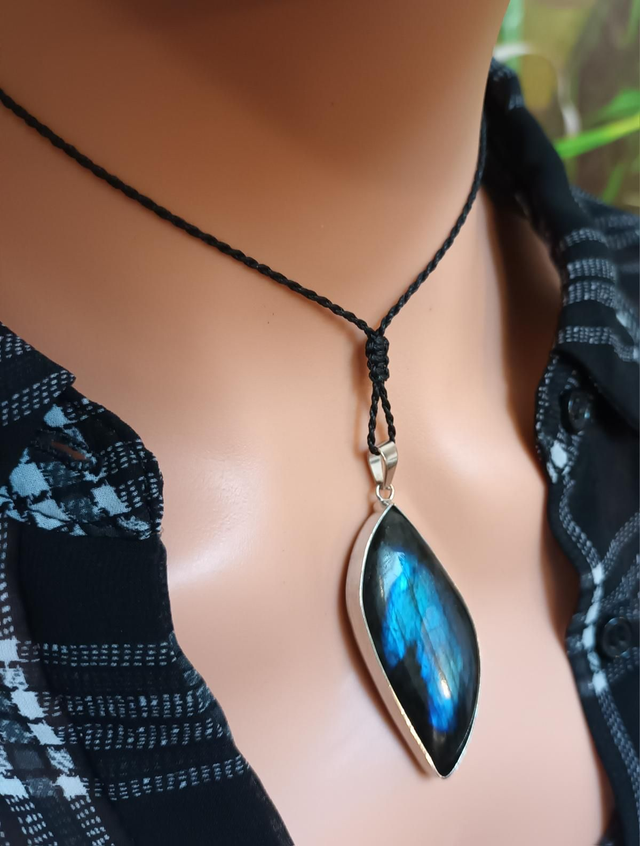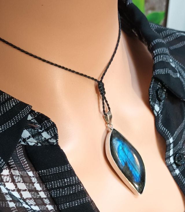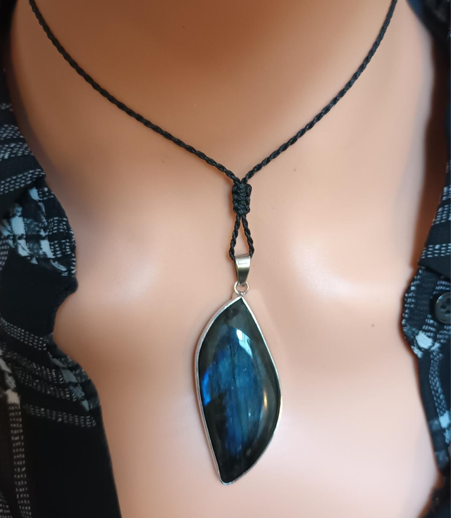 Ce pendentif met en valeur une magnifique pierre de labradorite d’environ 4,7 cm de hauteur et 2,2 cm de largeur, aux reflets changeants, sertie dans un métal solide qui souligne son éclat naturel. La pierre est montée sur un cordon en fil polyester ciré, travaillé en micro-macramé artisanal. Le lien est réglable, permettant d’adapter facilement la longueur pour un porté confortable et personnalisé.
