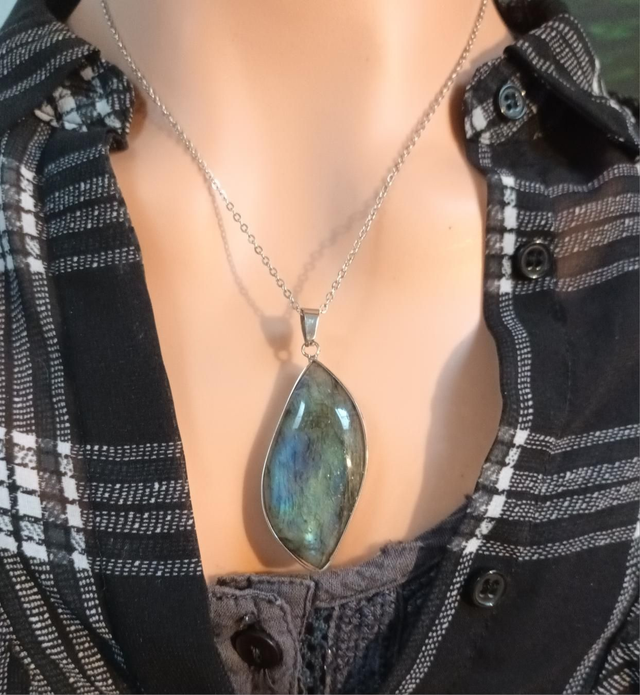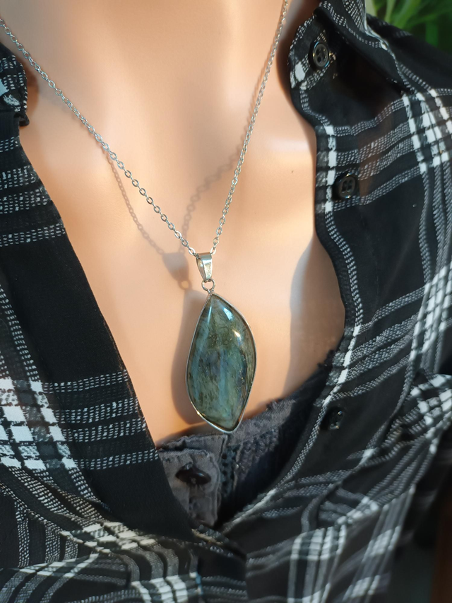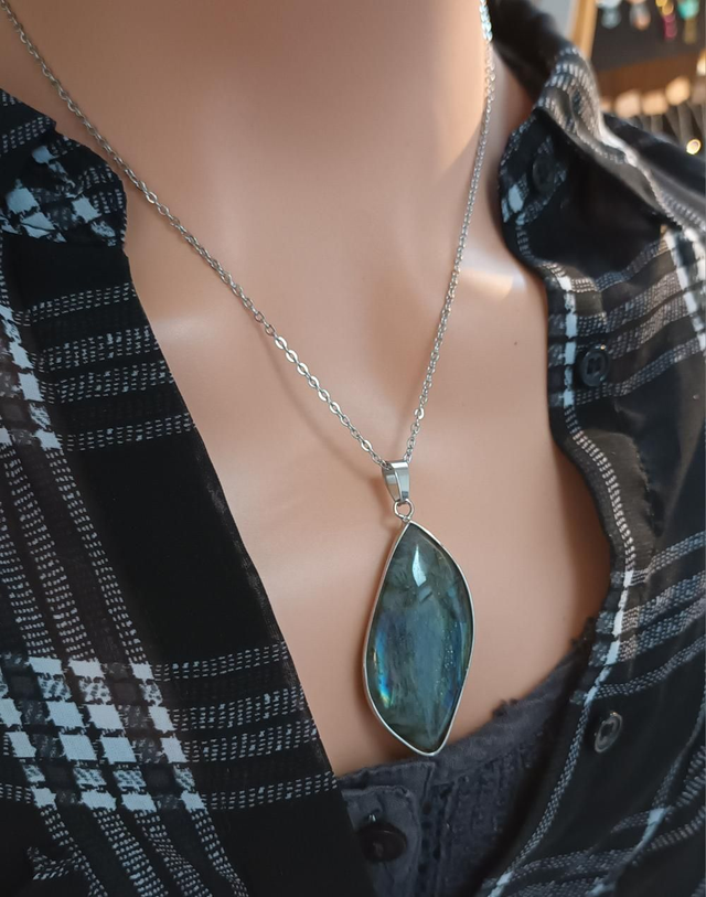 Ce pendentif est réalisé à partir d’une pierre naturelle de labradorite, aux reflets irisés allant du bleu au vert, qui captivent la lumière et révèlent toute la beauté mystérieuse de cette gemme. La pierre, d’une taille d’environ 4,4 cm de hauteur sur 2,2 cm de largeur, est sertie dans un métal solide qui souligne son éclat naturel. Elle est accompagnée d’une chaîne en acier inoxydable résistante et durable, parfaite pour un usage quotidien.