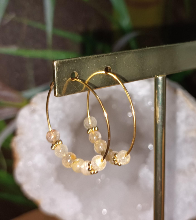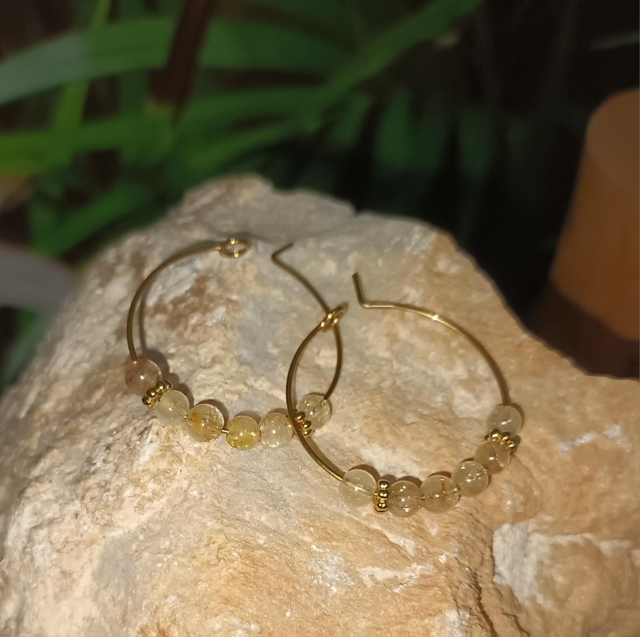 Ces boucles d’oreilles cercle allient la pureté du cristal de roche rutile à l’élégance intemporelle de l’acier inoxydable couleur or. Leur design épuré met en valeur les inclusions dorées naturelles du rutile, qui traversent le cristal comme des filaments de lumière. Anneau d’environ 2,5 cm de diamètre.